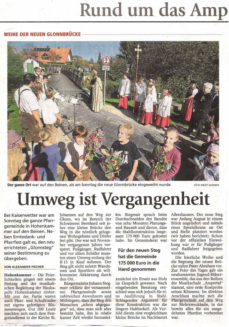 Zur Einweihung der neuen Glonnbrücke am 2. Oktober durften sie sich dann (mit etwas Unterstützung) und zwei Intraden im Namen aller Schüler für den nun wieder offenen kurzen Schulweg über die Glonn bedanken. (Siehe Freisinger Tagblatt vom 4. Oktober 2011)